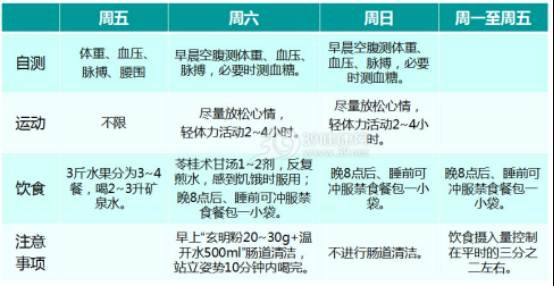 现在流行的禁食疗法,一般得坚持5-7天。秦鉴考虑到白领工作日禁食不太现实,就摸索出一套“周末禁食疗法”,不仅不耽误工作,还有助控制体重和预防疾病。只要预留一个你可以自由支配时间的周末,开两副中药(加味苓桂术甘汤)及少量玄明粉,就可以开始瘦身之旅啦。
