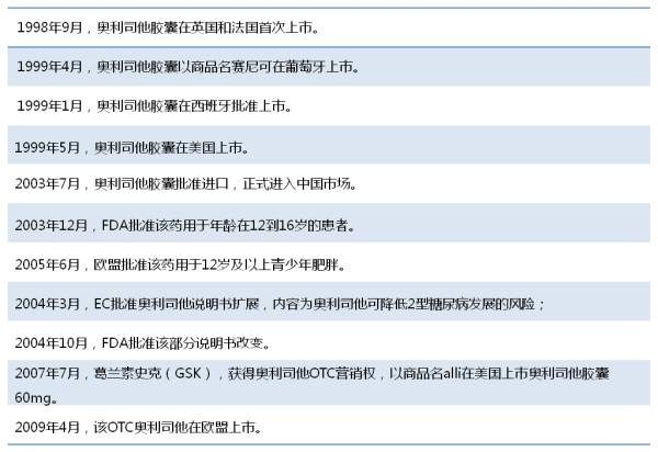 奥利司他是一种胃肠道脂肪酶抑制剂,由罗氏开发和上市,用于减轻体重和维持体重,并结合低热量饮食控制肥胖;还可用于减少在体重降低后的反弹。奥利司他于1998年首次上市,目前已在全球100多个国家上市。