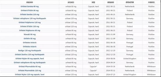 EMA:通过集中审批程序(CP),经欧盟药品管理局批准上市的奥利司他,主要为胶囊2家。